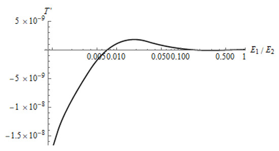Another important input parameter is the relative compliance of the layer (Figure 11). We chose here the thickness of the layer, which provided the separation effect for the relatively compliant layer. In this case, the deformation of the layer was much greater than that of the substrate. With an increase of the layer elastic modulus, the contact zones decreased and became relatively farther from each other. Mutual effect and tangential forces became weaker. The deformation of the substrate became comparable to the deformation of the layer, which led to the appearance of a positive tangential force. There is a value of at which the positive force reached its maximum value, then decreased.