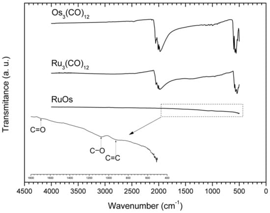 To confirm the absence of carbonyl groups in the material, the transmittance spectra were obtained for the precursors used and for the synthesized material. Figure 2 shows the comparative FT-IR spectra of the synthesized OsRu electrocatalyst and its precursors (Os3(CO)12 and Ru3(CO)12). For the precursors, two signals around 2000 and 500 cm−1 can be observed, related to the C-O stretching frequency of the carbonyl complexes (δC-O) and to the carbonyl deformation modes (δM-CO), respectively. For the OsRu electrocatalyst, no characteristic signals of the carbonyl groups can be seen, indicating that the metals present in the new material suffered a complete decarboxylation. In addition, by broadening the spectrum between 400 and 1800 cm−1, small signals appear around 900, 1100, and 1700 cm−1, which could be associated with C=C bending, C-O stretching, and C=O stretching, respectively []. The presence of the latter signals may be due to the decomposition of a small fraction of the solvent by microwave radiation, which may be part of the C phase observed.