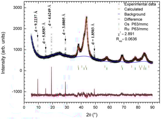 X-ray diffraction pattern of the OsRu electrocatalyst. In the plot, the black crosses represent the experimental data, the red line represents the calculated pattern, the blue line represents the background used for refinement, and the maroon line at the bottom represents the difference between the experimental and calculated pattern. The orange and green bars represent the positions of the Bragg peaks for Ru (P63/mmc) and Os (P63/mmc), respectively. In addition, for 2θ = 9.59°, 15.12°, 19.20°, 28.97°, and 49.24°, the distances (d) calculated in each case are presented. The goodness-of-fit parameters ( and Rwp) are also given.