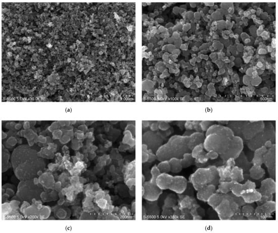 Scanning electron micrographs of the OsRu electrocatalyst synthesized at 180 °C by microwave radiation in 1,2-dichlorobenzene, at (a) 30×, (b) 100×, (c) 200× and (d) 350× magnifications.