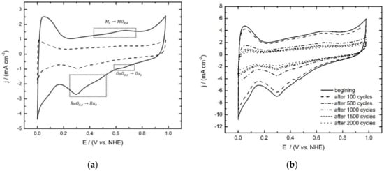 The cyclic voltammograms of the OsRu electrocatalyst inks are shown in Figure 5 in conjunction with stability proofs. In Figure 5a, it is shown that both inks keep hydrogen adsorption and desorption peaks from 0 to 0.1 V/NHE and the oxygen evolution in the anodic 0.8–1.0 V/NHE zone; as same as the slight anodic and cathodic peaks in the 0.4–0.6 V/NHE region ascribed to the formation and reduction of superficial ruthenium oxides and a remarkable cathodic peak observed at ∼0.2–0.4 V/NHE associated to the reduction of the oxide film formed (RuOx,s). The main difference may be that the ORR ink voltammogram shows a more clear oxidation and reduction zone at 0.6–0.8 V/NHE, attributed to the oxidation–reduction process of osmium metal particles (OsOx,s), while the HOR ink voltammogram resulted in a more Ru profile type, which may be due to the low Os at% combined with the minor electrocatalyst load on the electrode. Despite this fact, both cyclic voltammograms show the characteristic regions that confirm the presence of Os [] and Ru [,].