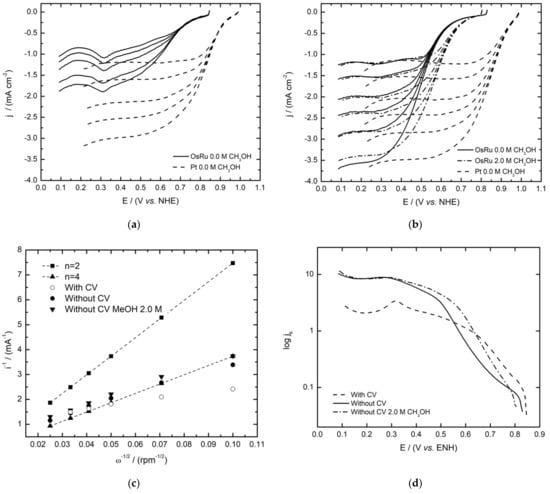 On the other hand, Figure 7d shows the mass-corrected Tafel plots for the ORR in the absence and presence of methanol for the non-activated ink and in its absence for the activated one. Through analysis, electrokinetic parameters were obtained and are summarized in Table 5 in conjunction with the OCP values for the OsRu electrocatalyst and the parameters reported in the literature for the mono [,] and bimetallic materials []. It can be observed that the OCPs are quite near one another, being slightly higher for the new electrocatalyst with CV before ORR study. In the presence of methanol (OsRu without CV before ORR), it only decreases by a small amount (~0.02 V/NHE), which is not the case, for example, for the Os electrocatalyst, which diminished by 0.16 V/NHE (almost seven times more). Furthermore, even though the other electrocatalysts did not experience a significant loss of OCPs, the OsRu material shows one of the greatest j0 values in all the situations, which is one of the most important kinetic parameters, being comparable even with Pt values. Bimetallic materials show a similar behavior to the reported Ru catalyst, so the ORR could be mainly performed by Ru activity. Based on electrokinetic parameters, it is not possible to establish conclusions between inks, as the metal oxide film formed during CV affects the electrokinetic parameters, where a high Tafel slope is observed, which in turn results in low α and high j0 values, which could be attributed to the current imposition of the ruthenium oxide, so kinetic parameters for that ink would not be reliable. Similar behavior is observed for the metallic Ru electrocatalyst reported in the literature [].