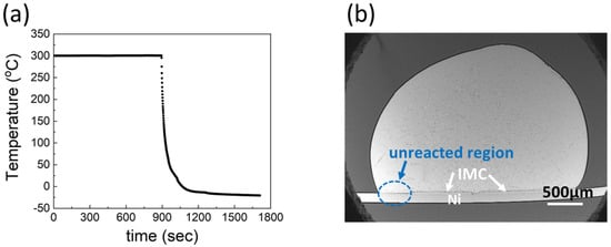 Ga metal (99.999%) and Ni foil (99.994%, 0.1 mm thick) were purchased from Alfa Aesar. The surface of Ni was cleaned, and etched with a mild HCl solution to remove surface oxides and improve the wettability. To fabricate the specimens for interfacial reactions between Ga and Ni, 0.05 g of Ga metal was dropped on a 0.1 mm thick Ni foil with dimensions of 5 mm × 10 mm, and reacted at temperatures of 250, 300, and 350 °C, respectively. The interfacial reactions were conducted in a convection oven for 10–240 min. After the reactions, the specimens were cooled in air for 2 min, followed by solidification in a freezer for over 30 min at −20 °C. An example of heat treatment process is presented in Figure 1a. The specimens were then mounted in epoxy, ground, and polished in order to examine their cross-sections. Ga etching was conducted using a mild HCl solution (10 vol.%, in DI water), to clearly distinguish the IMCs from the unreacted Ga. A reaction product is presented in Figure 1b. The Ni substrates did not completely react with Ga at 250 and 300 °C. For example, no IMC was observed on the left-hand side of the specimen reacted at 300 °C for 60 min, as shown in the circled area in the figure.