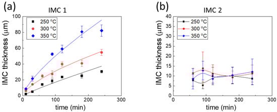 Measured thicknesses of the (a) IMC underlayer and (b) IMC overlayer at the reaction interfaces as a function of the reaction time.