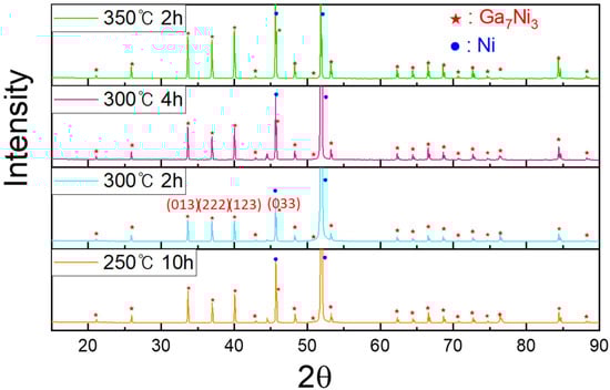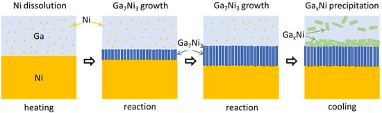In Figure 8, we present a schematic diagram for a better understanding of the reaction sequence. When the specimen composed of liquid Ga on a solid Ni substrate was heated, Ni atoms were dissolved into the liquid Ga. From the Ga-Ni phase diagram, the solubilities of Ni in Ga were approximately 1.5, 2.0, and 2.7 at.% for reaction temperatures of 250, 300, and 350 °C, respectively. At the reaction temperatures, the Ga7Ni3 phase grew at the interface between Ga and Ni. The formation of the Ga7Ni3 phase has also been reported in the literature, in the temperature range of 200–350 °C [19,20]. Meanwhile, the Ga3Ni2 phase was reported to form at a higher temperature of 500 °C [19], or at a prolonged reaction time of 3 h at 300 °C [20]. However, this phase was not observed in any specimen fabricated in this study, as shown in Figure 2. The Ga7Ni3 IMC grew continuously, at the expense of the Ni substrate. After cooling, GaxNi IMCs were observed on top of the Ga7Ni3 IMC layer and inside the unreacted Ga. Theoretically, the Ga7Ni3 phase should also precipitate out from inside the liquid Ga during cooling from the reaction temperature to ~100 °C, because the Ga-rich phase cannot exist over its melting temperature [21]. However, in this study, the Ga7Ni3 IMCs were found only at the reaction interfaces, and not inside the Ga after the reactions. The rapid cooling rate may be attributed to the scant formation of the Ga7Ni3 phase inside the Ga. The specimens took less than 1 min to cool down from the reaction temperature to 100 °C, as shown in Figure 1a. Consequently, only the GaxNi phase precipitated inside the liquid Ga during the cooling process. A study on the Ga-Ni reaction at low temperatures under 200 °C has not yet been reported.