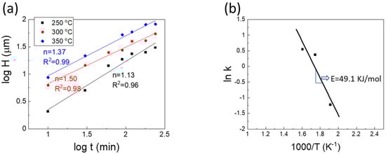 A log–log plot of the interfacial Ga7Ni3 IMC thickness versus reaction time is presented in Figure 9. The empirical kinetic equation for IMC growth is usually written in the form of Equation (1).