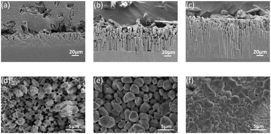 To further elucidate the IMC growth mechanism through more detailed studies of the IMC shape, cross-sectional SEM micrographs of interfacial Ga7Ni3 IMCs, after the deep etching of Ga, are presented in Figure 10a–c. The Ga7Ni3 IMCs formed during the reaction were long rods, and they grew only in a vertical direction with increasing reaction time. During their growth, no merging and no lateral coarsening of the IMC rods occurred. Plane-view SEM micrographs of the Ga7Ni3 IMCs, after the complete etching of unreacted Ga, are also presented in Figure 10d–f. The Ga7Ni3 IMC layers are observed to be very porous compared to the well-known Cu6Sn5 or Ni3Sn4 IMC layers, and the porosity decreases with increasing reaction temperature. When the reaction temperature was 250 °C, a large number of big holes were formed inside the IMC layer, whose diameters were approximately 0.6–1.0 μm. Large cavities occurred in regions where several holes were gathered closely. At 300 °C, the size and number of holes decreased. Most holes ranged from 0.5–0.8 μm in diameter. At 350 °C, small holes were observed around the triple points of the IMC rods. As the temperature increased, the individual IMCs became more distinct in shape, while the vacant areas between them became increasingly smaller.
