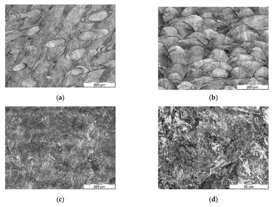 Microstructural analysis of the as printed material (Figure 1a,b) shows a morphology reminiscent of a weld overlay in a criss-cross pattern; this is consistent with the accumulation of material during printing and observations in the literature [15]. No significant instances were observed of defects such as porosity, cracks, or segregations. After heat treatment (Figure 1c,d), the grain is obscured by a fine distribution of precipitates; again, this is consistent with observations in the literature [13,15]. The original morphology appears to be unmodified and can still be recognized by careful observation, particularly in low-magnification images (Figure 1c).
