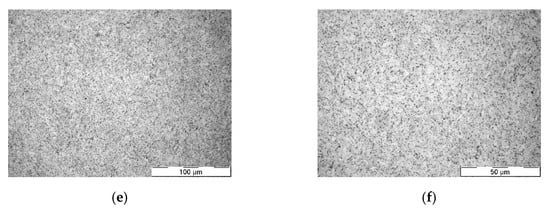 As a reference, conventional tool steel grade QRO90 was used, a commercial variation of hot work tool steel H13 (Table 1). This wrought tool steel was soft-machined, heat treated by quenching and tempering to a final nominal hardness of 50–52 HRC and finished. The microstructure obtained (Figure 1e,f) corresponds to the expected structure of a hot work tool steel, consisting in a matrix of tempered martensite with some small, rounded metal carbides, mainly VC. While the hard martensitic matrix strengthened by precipitates formed during tempering, is similar to the maraging matrix, the presence of microscopic carbides supposes a significant difference. The grain morphology shows basically equiaxial grains, formed during the heat treatment of the wrought block of material, as opposed to the microstructure oriented in planes in 3D printed material.