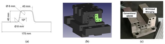Component geometry was based in an omega-shape, a common concept in press hardening literature. The final geometry was defined based on a survey of cross-section measurements obtained from production B-pillars during research project HardTrim (Figure 2a). The dimensions thus defined were considered to combine a relevant example of the working conditions of industrial tooling with ease of inspection. Tool laterals were designed as two symmetrical replaceable inserts. One side was manufactured in commercial hot work tool steel QRO90 heat treated to 50–52 HRC. The other side was produced with steel MS1 through Additive Manufacturing and aged to 52–54 HRC. This allowed direct side-by-side comparison of the two materials (Figure 2b,c).
