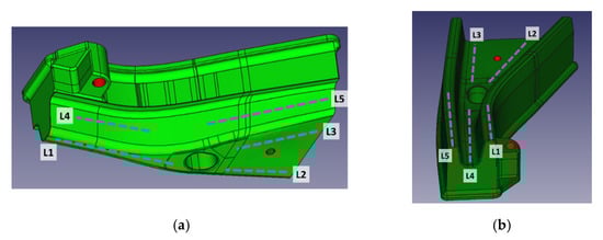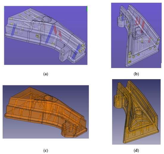 The second tool was produced by Additive Manufacturing, using the same MS1 material as in previous trials, heat treated to 52–54 HRC. The external shape and morphology were equivalent to the conventional tool. However, cooling channels were redesigned based in a conformal cooling concept, with channels following the surface and reaching zones with complicated access. This design was human-proposed as a demonstrator, no explicit FE or AI-based optimization methods were used (Figure 3c,d).