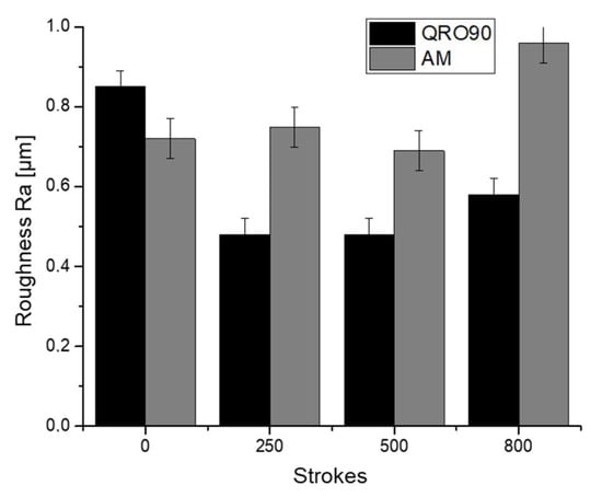Behavior of the two materials is slightly different. In the case of QRO90, there appears to be a running-in phase in which roughness rapidly diminishes in the first 250 cycles as the first contact cycles eliminate remaining tool asperities. At this point, roughness remains stable during the rest of the test, with a slight tendency to increase that could be linked to the appearance of slight scratches or minute instances of material transfer.