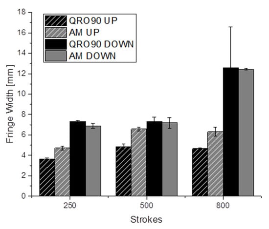 For the upper fringe, however, slight differences were observed, with the QRO90 side experiencing less severe wear and stabilizing at a lower value that the additive manufactured insert (Figure 8).