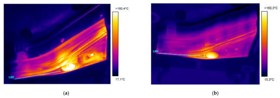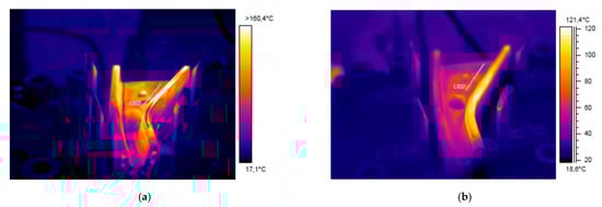 Thermal images from the die after performing 20 production cycles: (a) Conventional tool; (b) 3D printed tool. Different scales had to be used due to the differences in temperature levels and distribution.