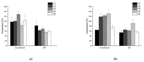 Thermal images qualitatively showing the temperature distribution through each of the tool parts are presented in Figure 9 and Figure 10. A plot comparing temperature in different tool areas is shown in Figure 11. In general terms, the additive manufactured tool presents overall lower temperature, as well as a more homogeneous distribution.