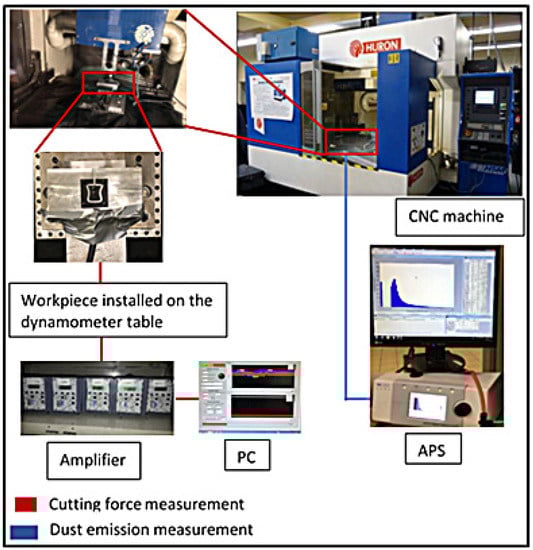 Down milling experiments were carried out using a HURON-K2X10 3-axis CNC machine tool with maximum spindle speed (N), 28,000 rpm; power (P), 50 kW; and torque (T), 50 Nm. A dynamometer (type Kistler 9255B) was clamped on the machine table and connected to the charge amplifiers (Kistler 5010) (Kistler Materials 2020, 13, 1181 5 of 22 Instrument Corporation, New York, NY, USA) that generated output signals, which were transmitted to a data translation card (type DT 9836, Data Translation Inc., Marlborough, MA, USA), linked to a personal computer. All signals, monitored independently, were digitized and recorded using LabView software program in order to analyze force measurements. An Aerodynamic Particle Sizer (APS, model 3321, TSI Inc., Shoreview, MN, USA) capable of measuring the aerodynamic size of particles from 0.5 to 20 microns. The dust samples were sucked by a pump (1.5 L/min) through a 10-millimeter suction tube, with the end of the tube placed near the machining area. The suction tube was connected to the dust measurement system, which consisted of an aerodynamic particle sizer (APS) spectrometer. The collected data were then analyzed using the TSI’s Aerosol Instrument Manager software. The experimental scheme is illustrated in Figure 1. The dust sampling was performed during the machining process (doors closed). The APS record signal was initiated 3 s before the cutting process started and was completed, after the end of the testing, when the dust measurement was near to zero.