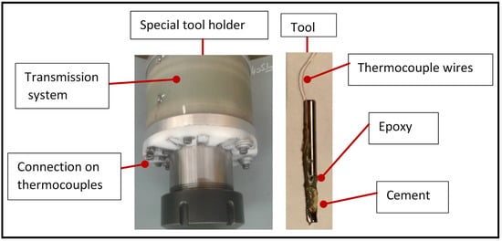 Two K-type thermocouples (made from nickel–chromium wires each of 0.076 mm diameter (0.003 in.)) were used for measuring the temperature during machining. The characteristics of the thermocouples are presented in Table 3. Figure 3 shows a schematic representation of the cutting temperature/forces measurement system used. The thermocouples were installed on the tool, 2.2 mm from the tool tip to ensure the performance of temperature measurement. The thermocouple was held first by adhesive, then glued to the tooth by cement (OMEGABOND® 400 # OB-400), which is an excellent thermal conductor. The tool was then left for 24 h in the open air. Once baked, the cement was covered with epoxy resin to protect it and ensure adhesion. The epoxy resin forms a sort of bridge between two teeth and protects the cement, which is very brittle, from the flow of chips. In all cases, the axial depth of cut was kept constant at 2 mm, such that the thermocouples were located at a distance of 0.2 mm from the cutting area. The tool was then mounted in a special holder (Type M-320, manufactured by Michigan Scientific Corporation, Charlevoix, MI, USA). It is equipped with connections for thermocouples and data were subsequently relayed and recorded (simultaneously with cutting force traces).