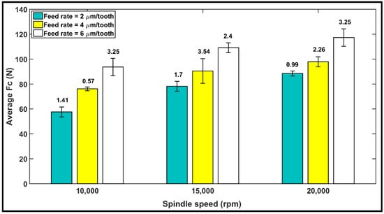 The bar diagram in Figure 4 shows the average of the measured cutting forces Fc obtained from the cutting tests, with the error bars indicating standard deviation. Each bar diagram shows the magnitude of the average cutting forces during milling of the CFRP using a specific feed rate and spindle speed. From Figure 4, it can be seen that the cutting forces increase proportionally as the feed rate (i.e., chip thickness) increases. This phenomenon can be attributed to an increase in chip loads and volume of material removal at a higher feed rate, leading to an increase in the magnitude of Fc.