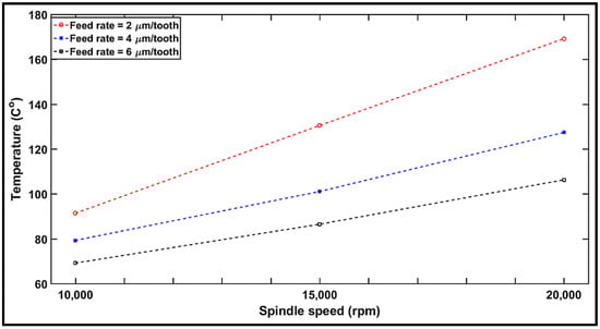 Figure 5 shows the evolution of the temperature registered during milling with respect to spindle speeds of 10,000, 15,000, and 20,000 rpm (i.e., vc = 100, 150, and 200 m/min) at the feed rates of 2, 4, and 6 µm/tooth, respectively, after machined distances Lc = 105 mm. The machining temperatures range from 69 to 170 °C. It can be also seen from Figure 5 that the overall machining temperature increases with an increase in spindle speed from 10,000 to 20,000 rpm. This is could be due to the increase in the friction between the cutting tool and the machined surface [27]. S. Gara et al. [51] measured the cutting temperature during machining of a multidirectional CFRP laminate. The experiments were conducted on a computer numerical control (CNC) machine with the cutting speed ranging from 80 to 200 m/min and the feed rate from 0.008 to 0.060 mm/tooth. The data were analyzed in order to establish empirical models showing the dependence of cutting temperature on tool geometry and cutting conditions. Based on the results, it was concluded that cutting speed is the factor influencing cutting temperature the most.