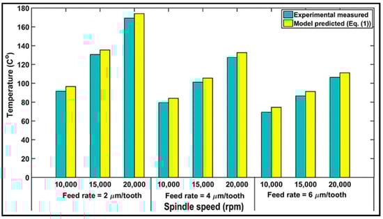 For validation purposes, a comparison between the cutting temperature measured by the K-type thermocouple from the experimental tests and the predicted cutting temperature calculated based on the proposed model, Equation (1), under the same cutting conditions, is performed. The results are displayed in Figure 6. It should be noted that the cutting conditions for the milling experiments were presented in Section 3.4, while the model was performed for material parameters of the CFRP cited from Ref. [41] and given in Table 1. Figure 6 also illustrates the maximum temperature generated during milling with respect to feed rate at spindle speeds of 10,000, 15,000, and 20,000 rpm (i.e., 100, 150, and 200 m/min). The simulated value of the temperature with respect to speed is found to rise with an increase in spindle speed and is predicted to be minimum for the 10,000-rpm speed (i.e., vc = 100 m/min). This agrees with the experimental results. A good agreement was also observed between the experimental and predicted values of the temperature for the feed rate, similar to Figure 6. The relative errors between the predicted and experimental values of temperature are found to be about 7%. Nevertheless, because the temperatures were measured at 0.2 mm from the axial depth of cut, ap, it could be argued that the temperature is higher for the model than for the experiments. Consequently, it may be summarized that the model can predict the temperature with a good degree of accuracy.