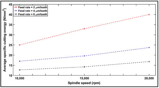 Specific cutting energy (or specific cutting pressure), defined as the cutting force per unit area of the uncut chip, was calculated based on Equation (4), as shown in Figure 7. The chip thicknesses ac of each laminate ranged from 0.0023 to 0.0044 mm, corresponding to the feed per tooth values of 2, 4, and 6 µm/tooth. It can be seen in Figure 7 that the average specific cutting energy for the cutting force Fc decreased with an increase in feed rate but increased when the spindle speed increased. This is due to the fact that specific cutting energy is critically dependent on the feed rate (i.e., chip thickness), which is a function of the cutting engagement angle, φ. Our observation of the specific cutting energy is described in Section 2, Equation (6), which confirms the correlation between the increase in the specific cutting energy and the feed rate (i.e., chip thickness). It also indicates that the highest specific cutting energy recorded is 40.7 N/mm2 at 20,000 rpm (vc = 200 m/min) and a feed rate of 2 µm/tooth (0.002 mm/rev) and the lowest specific cutting energy is 12.7 N/mm2 at 10,000 rpm (vc = 100 m/min) and a feed rate of 6 µm/tooth (0.006 mm/rev). However, the specific cutting energy for CFRP composites is well below that of metals. The comportment of specific cutting energy regarding cutting speed is similar to that of the cutting force (Section 4.1), whereas it varies considerably with feed rate. A significantly higher specific cutting energy is required for removing small chips (small feed rate). For a high cutting speed and large chip size, the specific cutting energy for the tested composite tends to become constant. Therefore, from a material removal rate point of view, better machinability of CFRPs can be achieved with high feed rates and cutting speeds.
