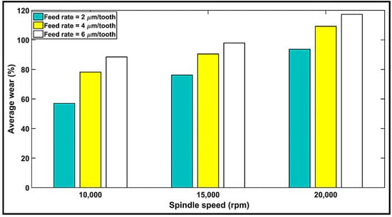 Variation in tool wear (%) with respect to spindle speeds and feed rates after cutting a distance Lc of 105 mm.