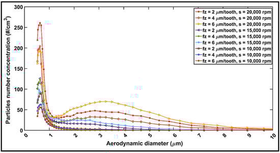 It can be seen from (d) in Table 5 that the feed rate had the greatest effect on tool wear, with the spindle speed as the next most influent factor. The fine particle emission was also analyzed. In this work, the fine particles studied have diameters ranging from 0.5 to 10 mm.