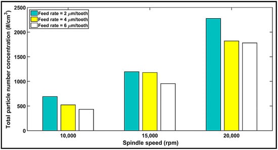 The maximum number of dust particles corresponding to different sizes as obtained in the experiments performed are plotted in Figure 9, depicting the peak-to-peak magnitudes for all cutting conditions. According to the collected data, the highest numbers of particles were registered for particles in the range 0.5–1 μm, followed by those with sizes between 2 and 7.5 μm, indicating a decrease in the number of particles with an increase in the feed rate, but an opposite effect with an increase in the spindle speed. Overall, the highest numbers of particles are obtained at 20,000 rpm spindle speed with 2 µm/tooth feed rate for 0.5–1 µm sized particles, as is also the case for the 1–7.5 µm sized particles. In contrast, at a 10,000-rpm spindle speed with a 6 µm/tooth feed rate, minimum numbers of particles are obtained. The following two important points were consistently noted in all the experiments: firstly, regardless of the feed rate used or the highest number of particles, the size of particles increased with speed, ranging from 0.5 to 2.5 µm at 10,000 rpm, and 0.5 to 7.5 µm at 20,000 rpm. This is explained by the higher cutting temperatures, as elaborated in Section 4.2 where an increase in the temperature was correlated with an increase in the number of particles. The second observation was that regardless of the spindle speed or the peak emission, the 2 and 4 µm/tooth feed rates displayed similar highest number of particles at a 15,000-rpm speed. However, when using a feed rate of 2 µm/tooth, a second peak of particle emission appears for particle size ranging from 2.0 to 2.5 µm. Likewise, the 4 and 6 µm/tooth feed rates offered the same highest number of particles at a 20,000-rpm speed. This observation is evident from the total particle number concentration (see Figure 10). However, the feed rate seems to have a limited influence as compared to that of speed. This is also observable in the analysis of variance (ANOVA) presented in Table 5. The influences of spindle speed and feed rate can be explained by the chip formation process during the machining of composites [38,52]. The shearing process, the chip separation and deformation, and the frictions in the shearing zone and at the chip–tool and tool–workpiece interfaces produce a lot of dust [53]. At low speeds, the chip crack is controlled by its brittleness. Therefore, there is limited contact and friction between its lips due to the crack opening [54]. A burr tool would generate a minimum number of particles when compared to a flat (traditional) tool, as reported by Haddad et al. [39]. Thus, it can be concluded that tool geometry is an important factor in dust emission. One can also conclude from Figure 9 and Figure 10 that in order to reduce the dust emission at low spindle speed, chip thickness should be increased by either decreasing the spindle speed or increasing the feed rate.