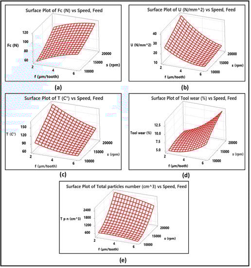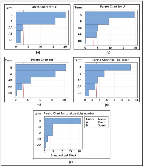 The Pareto diagrams in Figure 11 illustrate the effect of the input parameters (feed and speed) on the output parameters (cutting force, temperature, specific cutting energy, tool wear, and dust emission). It can be seen from Figure 11 that the feed rate has a significant influence on specific cutting energy and tool wear, while spindle speed was shown to be the most effective factor with respect to the cutting force, temperature, and total particles number.