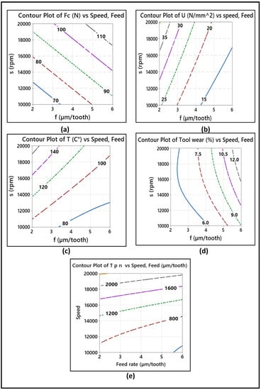 With respect to temperature, (c) in Table 5 indicates that the speed was statistically significant followed by the feed rate and interaction f * s, while the interactions f * f and s * s had no influence.