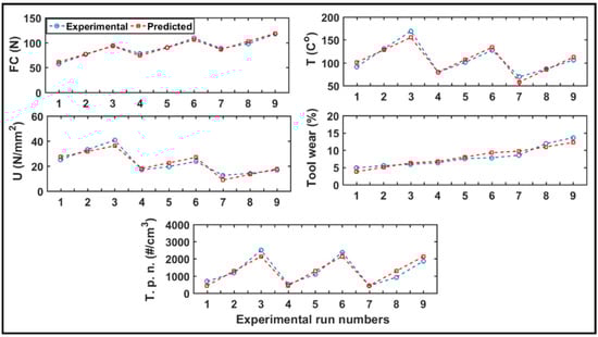 The response surface methodology (RSM) establishes a mathematical relationship between two sets of data [55] with one set being the independent variables, i.e., cutting speed and feed rate, whereas the other set is the dependent variables or quality characteristics, i.e., cutting force, specific cutting energy, temperature, tool wear, and dust emission. This mathematical relation can be either first order (linear) or second order (quadratic). In the present work, RSM models were applied using a statistical software Minitab® 20.3 to establish relationships between the input parameters (independent variables) and the output responses (dependent variables). R-squared is a statistical measure of how close the data are to the fitted regression line. Another correlation coefficient often used is the adjusted R-squared, which is a modified version of R2 that has been adjusted for the number of predictors in the model. While the adjusted R2 also indicates how well terms fit a curve or line, it adjusts for the number of terms in a model and helps in determining if a new term improves a model. The correlation coefficients R2 and R2 adjusted for output parameters (cutting force, specific cutting energy, temperature, and total particle numbers) are given in Table 6. The results obtained for the coefficients indicate that the model used is quite adequate for prediction purposes. The predictive fit model equations for cutting force, specific cutting energy, temperature, tool wear, and total particle numbers were obtained as follows: