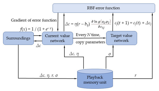 The radial basis function (RBF) neural network is a neural network technology that interpolates in a high-latitude space and usually consists of an input layer, a hidden layer, and an output layer. There are three parameters that RBF needs to learn to determine, which are the center of the radial basis function, the variance, and the weights between the output layers of the hidden layer domain. According to the different radial basis function center methods, the radial basis function neural network has a variety of learning methods, such as the random selection center method, the self-organizing map selection center method, the supervised selection center method, and the orthogonal least-squares method. Traditional learning methods will cause RBF neural networks to fall into local optimal solutions and other related problems, so this paper combines reinforcement learning (RL) and a self-organizing map (SOM).