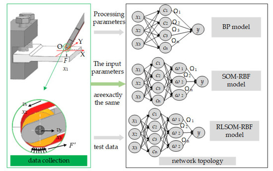 By analyzing the errors and training results of the three algorithm models it can be determined that the RLSOM-RBF neural network prediction model is more effective than the other two (BP model and SOM-RBF model) in predicting the surface roughness of superalloy under abrasive belt grinding. This shows that reinforcement learning is not only effective for the modification of the traditional RBF neural network training method, but also shows adaptability in predicting the surface roughness of superalloy under abrasive belt grinding. The characteristics of superalloys make them prone to work hardening, inversion of the relationship between the abrasive grains and the workpiece, abrasive wear, etc., in the process of grinding superalloys by abrasive belt, resulting in the BP model and the SOM-RBF model not being able to fit the processing conditions well. In addition, the high nonlinearity and high coupling characteristics of abrasive belt grinding increase the difficulty of prediction in these two models.