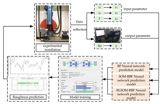 First of all, the use of reinforcement learning (RL) improved the SOM method. Three layers of competition according to the competitive reward mechanism structure of the neural network prediction data clustering model were used. Then, by using the improved stochastic gradient reinforcement training model parameters and updating the clustering center, eventually the competitive clustering center of the biggest set of neurons became the center of the radial basis, which improved the traditional radial basis neural network training method and allowed it to easily to fall into the optimal local solution. Second, through the design of crossing one hundred percent of the abrasive belt grinding tests, every ten groups of data were considered a dataset wherein nine groups were considered the training data and one set was the experimental data. We recorded the relative error value and the average relative error of the prediction 10 times in order to obtain the model accuracy. Through comparisons of the three kinds of algorithms, one can see that the BP neural network prediction model of surface roughness displayed an average relative error of 3.55%, the SOM-RBF neural network prediction model of surface roughness gave a poor relative average of 3.35%, and the average relative error of the surface roughness prediction model of the RLSOM-RBF neural network was only 1.73%, indicating that it is effective in improving the traditional training method through reinforcement learning. Finally, by using much of the abrasive belt grinding experiment data as the training sample and importing the three surface roughness prediction models of the neural network, we were able to analyze the error curved surface model, the model error, the training results, and the changes in the parameters. Through this analysis, we determined that the RLSOM-RBF model prediction is better than the SOM-RBF model and is superior to the BP model. By analyzing the R values fitted by the three prediction models, we can see that the R-value of the RLSOM-RBF model is 0.996, the R-value of the SOM-RBF neural network model is 0.923, and the R-value of the BP neural network model is 0.765. It shows that using the reinforcement algorithm to improve the traditional radial basis training center is very effective because it can solve highly nonlinear and highly coupled characteristics and can be used to predict the surface roughness of superalloy belt grinding.