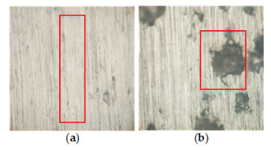 Before the single-factor experiment, an exploratory experiment was conducted to determine the appropriate parameter selection range, and to detect the initial surface roughness of the test piece. The selected processing parameters, which contain the abrasive belt speed, feed rate, and grinding pressure, are the ones that directly affect the abrasive belt grinding processing, so these three parameters are selected as input parameters. The parameter selection is shown in Table 3, which mainly focuses on the surface quality of the processing under the combination of smaller and larger processing parameters. In the case of the smaller combination of processing parameters, the problem of empty grinding occurred, as shown in Figure 4a. Apparent surface defects appeared in the case of the larger processing parameter combination, as shown in Figure 4b.