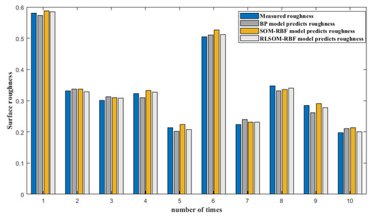 As can be seen from Figure 7, from the model error point of view, the RL-SOMRBF prediction model has a minor error of about 0.00178, followed by the SOMRBF prediction model with about 0.145; finally, the BP prediction model has an error of about 0.3741. It can be seen that for the prediction of the surface roughness of abrasive belt grinding, the RBF neural network prediction model is superior to the BP neural network prediction model. In addition, by improving the RBF training center method, the prediction accuracy of the RBF neural network can be improved.
