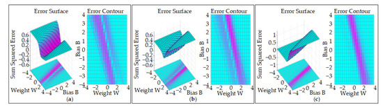 The error surface of neural network prediction models: (a) BP model; (b) SOM-RBF model; (c) RLSOM-RBF model.