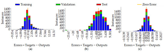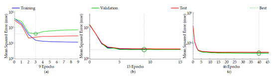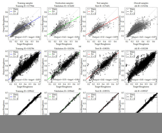 After the MATLAB training was completed, neural network training results graphs for three different surface roughness prediction models were obtained. From Figure 8a, we can see that the mean squared error (mse) of the BP model is significant, indicating that the accuracy of the model is not very high. As the model reaches the best accuracy, there are significant deviations in the training curve, test curve, and verification curve, indicating that training overfitting occurred during the process.