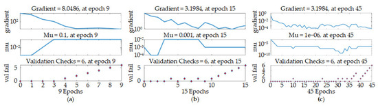 In Figure 9a, one can see that the gradient training of the BP model continues to decline, but the variable mu decreases with the gradient. The accumulated error reaches the maximum before the training is completed. The minimum error does indeed start to appear, and when the number of iterations is 9, the training parameters do not change; that is, they fall into the optimal local solution.