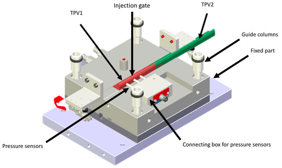 Overmoulding mould. The green and red profiles represent TPV2 and TPV1, respectively. Two pressure sensors are located at the inlet and at the outlet of the cavity. TPV1 is injected through a diameter sprue.