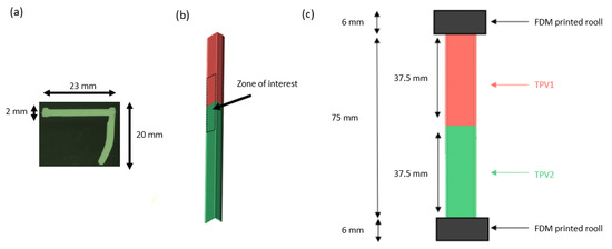 (a) Cross-section of the profile. (b) Zone of interest centred on the interface. (c) Dimensions of the specimens. FDM printed rolls of diameter were glued to the ends of the specimens.