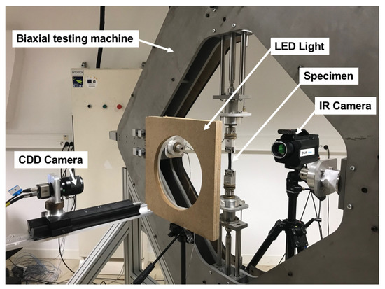 Figure 3 gives an overview of the experimental setup. It is composed of optical and infrared cameras, one on each side of a home-made biaxial testing machine. The tensile machine used is composed of four independent RCP4-RA6C-I-56P-4-300-P3-M (IAI) electrical actuators. They were driven by a PCON-CA-56P-I-PLP-2-0 controller and four PCON-CA (IAI) position controllers. The actuators were piloted by an in-house LabVIEW program. Two load cells measure the force in the perpendicular direction. Only one loading direction of the biaxial tensile machine was used for the present study and the specimens were mounted in the vertical direction. Two types of loading were applied. The first one corresponds to a monotonous tensile test until specimen failure at a rate of per actuator. The second one corresponds to one cyclic loading at the same loading rate and at a total displacement of and for specimens overmoulded at and , respectively. The displacements have been selected according to the maximum displacement reached during tensile test at failure.