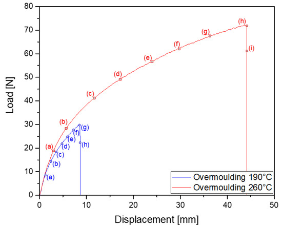 Figure 4 presents the mechanical behaviour during a monotonic tensile test until failure of the specimens overmoulded at and . Figure 5 and Figure 6 present the images of the specimens overmoulded at and at different times of the test, respectively. These times correspond to letters a to h and a to j for and , respectively. The interface is highlighted with a white arrow. At the beginning of the test, the shape of the curves is close. The force-displacement relationship is almost linear. For higher displacement levels, the specimens overmoulded at exhibits a higher stiffness. Moreover, the displacement at break is much lower for the specimens overmoulded at ( against for the specimens overmoulded at ). For both overmoulding temperatures, specimen failure occurred at the interface between the two TPV. The failure occurs at a lower force in the case of specimens overmoulded at than for specimens overmoulded at . For specimens overmoulded at , necking at the interface during the test is observed (Figure 6h). This may influence the strain state at the interface. Nevertheless, the spatial resolution of the full kinematic measurements did not enable us to further investigate this effect. This phenomenon is not observed for those overmoulded at . High relative deformations are reached for TPV2, while TPV1 shows low deformations. These remarks will be discussed in more detail in the next section.