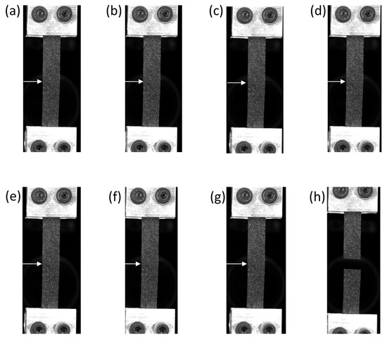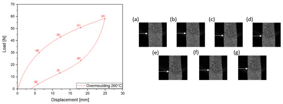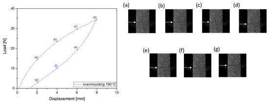 Cyclic loading 8 mm of specimens overmoulded at . Images (a–g) show a close-up view of the interface at different displacements during the test. TPV1 is at the bottom and TPV2 at the top.