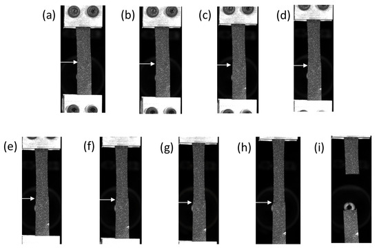 Cyclic loading 25 mm of specimens overmoulded at . Images (a–g) show a close-up view of the interface at different displacements during the test. TPV1 is at the bottom and TPV2 at the top. Necking can be seen for TPV1 in image (e).