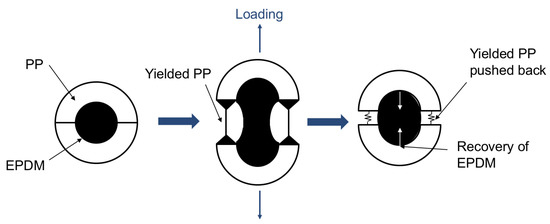 The low residual strain obtained after relatively high strains applied indicates that a low level of damage, typically plasticity, takes place during the mechanical cycle in the two specimens. This is in good agreement with Babu et al. [56], who used the TPV deformation model developed by Soliman et al. [57] to explain the behaviour of thermoplastic elastomers vulcanizate. This model explains that the deformation behaviour of TPV is the combination of matrix yielding and buckling because of the recovering tendency of the crosslinked EPDM particles (Figure 9). In our case, the mechanical response was the one of the specimens made of two different TPV. It could be useful to be able to distinguish their single responses during the test, i.e., to access mechanical information at a local scale. This is the reason the next sections focus on the response of each TPV using imaging.