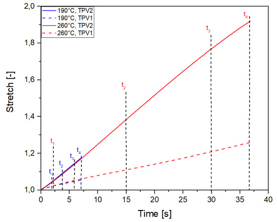 Stretch-time evolution for each TPV overmoulded at and , in the case of monotonic tensile test until rupture.