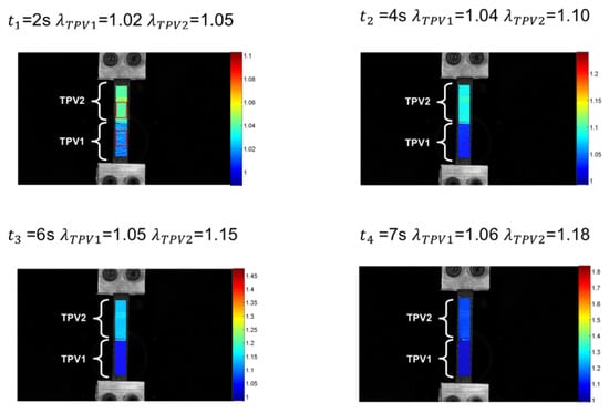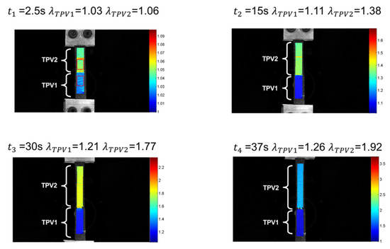 The DIC technique enables the determination of the kinematic field for the two constitutive TPV. Figure 10 presents the stretch versus time for both injection temperatures and for monotonic tensile test until rupture. For an injection temperature of , the stretch levels reached in each TPVs are lower than those observed for an injection temperature of . Referring to Section 3.1.2, this behaviour is explained by the temperature dependence of the diffusion mechanisms of PP macromolecules at the interface. For both injection temperatures, it is observed that the elongation reached in TPV2 at the end of the test is higher than that in TPV1. For an injection temperature of , = 1.18 versus = 1.06 (Figure 11), and for an injection temperature of , = 1.92 against = 1.26 (Figure 12). Figure 13 presents the stretch versus time for both injection temperatures and for mechanical cycle tests. From these two figures, it should be noted that TPV2 is much softer than TPV1. Therefore, the whole specimen made with these two TPV is not submitted to a homogeneous loading and consequently, the interface failure cannot be seen theoretically as a crack propagating within a homogeneous medium, meaning that it is complicated to apply the existing models of fracture mechanics to solve interface failure problems [58,59,60].