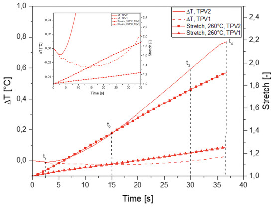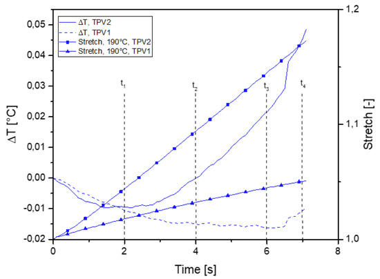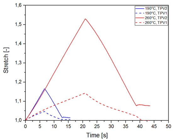 Stretch-time evolution for each TPV overmoulded at and , in the case of mechanical cycle.