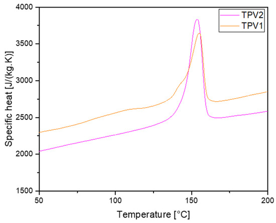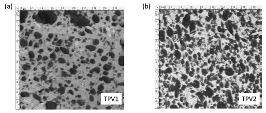 It should be noted that each TPV of the present study is obtained by a dynamic vulcanization process such as described in [21], which consists of mixing the two melt phases (PP and EPDM) and then in vulcanizing the EPDM. In this process, a phase inversion is obtained in the sense that the PP phase is initially dispersed in the EPDM phase and after the vulcanization, EPDM is dispersed in the PP phase. The final morphology of the mixing is determined by the relative amount of the two phases, their viscosity, the crosslink density and the type and amount of the vulcanization [22,23]. The main properties of TPV1 and TPV2 are given in Table 1.